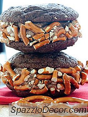 A los fanáticos dulces y salados les encantará este sándwich de helado súper chocolateado hecho de comida de bar. Un ligero toque de cerveza gruesa se combina perfectamente con los pretzels salados alrededor de los bordes.