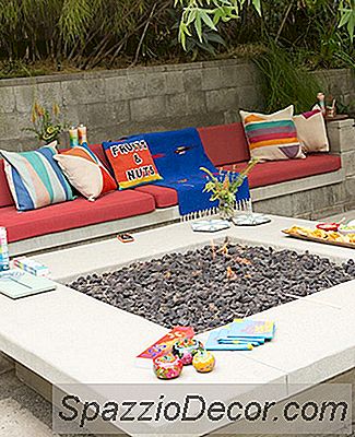 Alrededor de su fogata incorporada, se colocaron mantas de lana más coloridas y almohadas bordadas de Leah Singh entre las juguetonas almohadas "Fruits & Nuts" y "Surf & Turf" de las Hermanas de Los Ángeles. Cajas de calabaza pintadas, cerillas, servilletas y azulejos impresos de "Los Ángeles" que transforman el fuego de concreto se convierten en una estación de conversación acogedora.