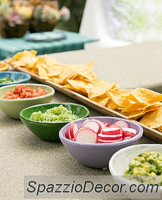 Los bocadillos son una necesidad para entretener y para mantener el chip y el chapuzón organizados, Stein usó una larga bandeja de madera y pequeños cuencos coloridos de R WOOD. Para su receta clásica de guacamole, hizo referencia a esta que menciona cómo la textura es la clave de este auténtico tratamiento de aguacate.